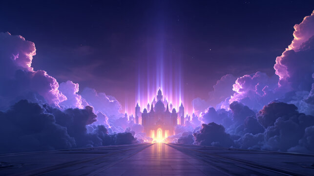 fantasy-style Ratha Yatra setting with divine light beams and glowing clouds