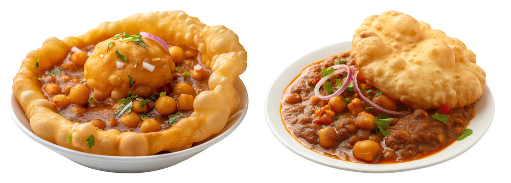 Set of Chole bhature is a North Indian food dish. A combination of chana masala and bhatura or puri. Isolated top view on transparent background, cutout png