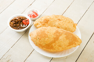 Chole Bhature or Chick pea curry with Fried Puri served in a ceramic plate and bowl