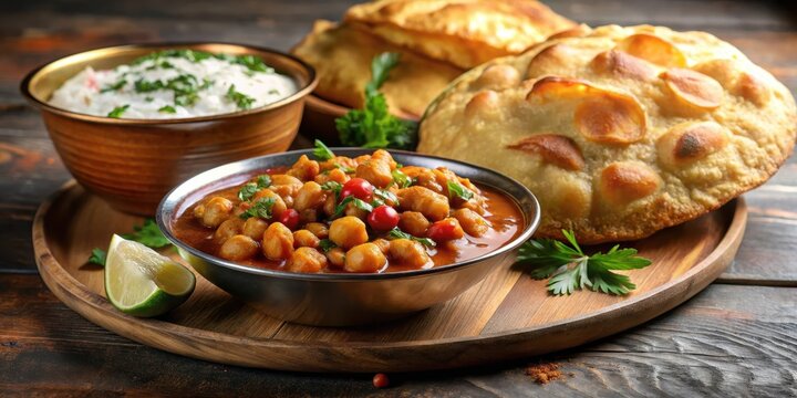 Crispy bhatura served with spicy chana masala and a dollop of raita, meal, food,  meal,food, puri, garnish