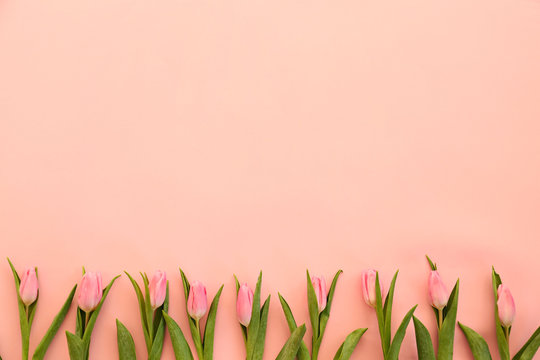 Fresh flower composition bouquet of bi color tulips pale pink and white gradient background International Womens day mothers day greeting concept. Fresh flower composition, bouquet of bi-color tulips,