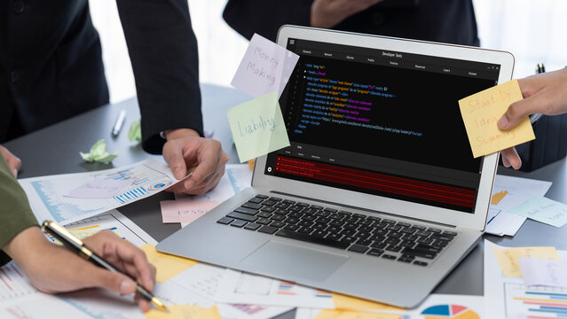 Analyst team use sticky note for creative and analytic brainstorm for business idea with BI data dashboard on laptop screen. Analysis financial data visualization tech for marketing strategy. Prodigy