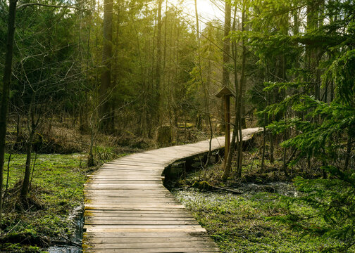 Wooden bridges across the swamp in the forest of Belovezhskaya Pushcha. Springtime alder bog forest with standing water, Bialowieza Forest, Poland, Europe