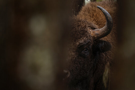 European bison in forest during autumn, fall in Bialowieza Forest, Poland