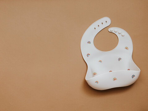 Brown silicone baby bib and and bowl. Serving baby. First baby accessories for dinner.  Top view, flat lay