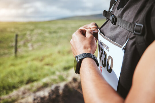 Hands, marathon and bib of man outdoor for running exercise, training and healthy body. Sport, race and competition number of athlete in cardio, fitness workout and wellness in countryside nature