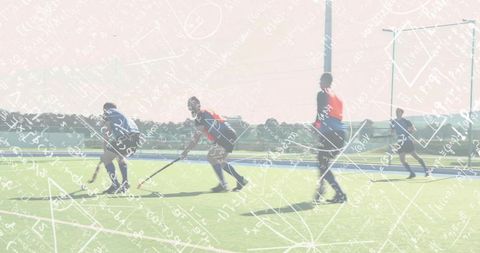 Field hockey players lunging for ball on turf with math overlay and teamwork concept