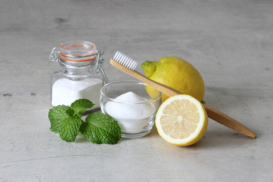 Baking soda, lemon, mint leaves and bamboo toothbrush on a gray concrete background  for teeth whitening at home.