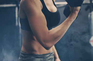 Beautiful woman doing bicep curls with dumbbells in a gym