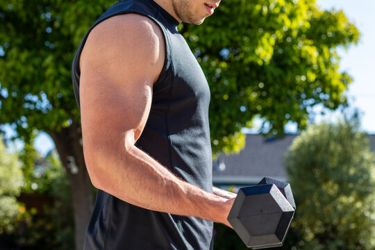 Fit man lifting dumbbells on backyard deck for outdoor workout