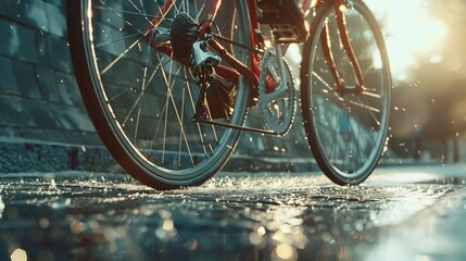A bicycle parked on a wet sidewalk