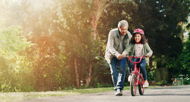 Teaching, grandfather and child on bicycle outdoor with safety, learning skills and development. Flare, space and senior man with girl on bike for cycling, trust or support with hobby in neighborhood