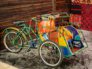 Great close-up of a yellow trishaw nicely decorated with colourful flowers, a flag and other trinkets which is a popular transportation for tourists in Malacca, Malaysia.