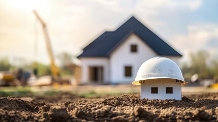 Construction concept with protective hardhats and house model representing new home development and safety in building projects