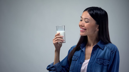 Asian lady holding milk glass, source of calcium and energy, bifid product