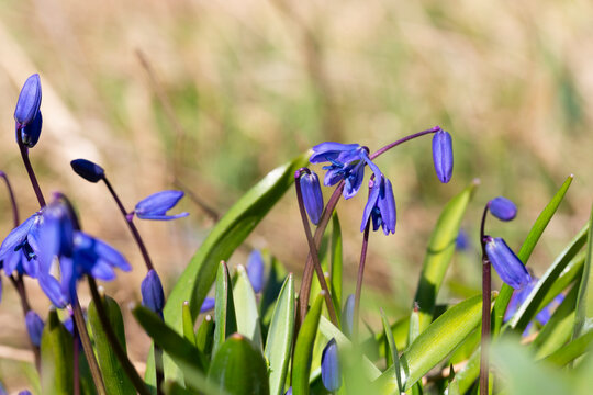 Macro shot of Snowdrop Scilla bifolia blooming in spring. Bellflower flowers with green leaves on natural blurred background.