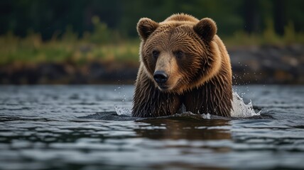A brown bear standing in a river, looking directly at the camera. The water is splashing around its paws as it moves through the water.