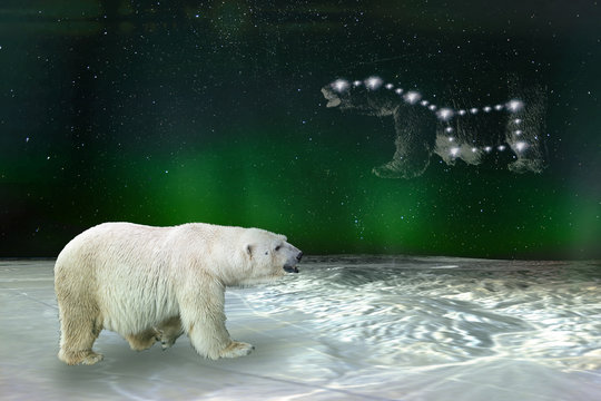 Polar bear and Ursa Major Great Bear constellation. Elements of this image furnished by NASA.