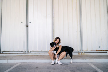 Full body side view of young female in casual outfit sitting with big dog near metal wall of urban building