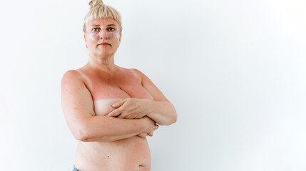 Chubby middle aged woman covering big breasts