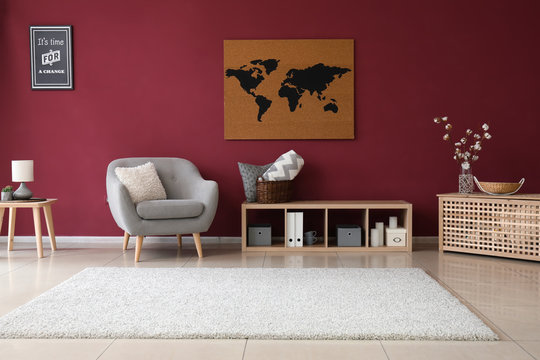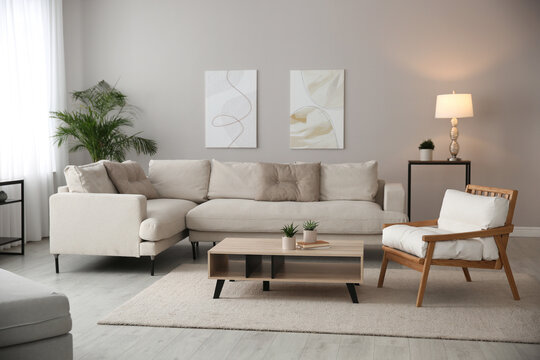 Large living room loft, bright, sunny interior. Big mockup canvas over the sofa