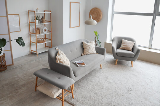 Spacious elegantly decorated big living space with fancy furniture with a sectional sofa and black cushions. with copy space image. Place for adding text or design