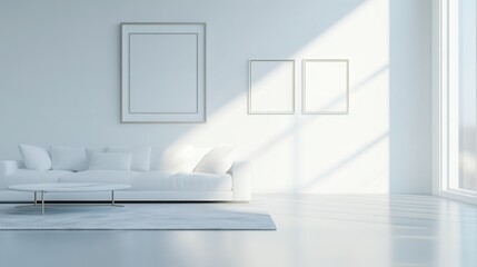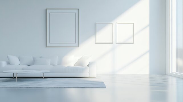 scandinavian interior, sofa with checkered blanket, interior table with stack of books on it, wooden floors, a big vertical picture frame hanging on the wall, mockup