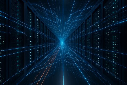 Modern data center hallway with glowing server racks and bright LED lights creating a futuristic, high-tech atmosphere for innovative technology concepts.
