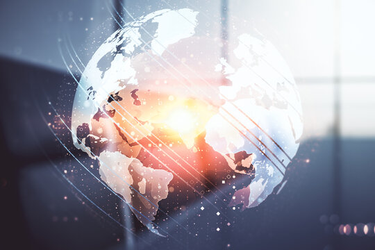 Abstract creative digital world map on a modern coworking room background, globalization concept. Multiexposure