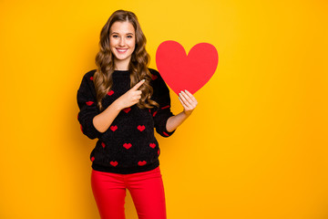 Photo of amazing curly lady amour hold big paper heart indicating finger creative idea date invitation wear hearts pattern sweater red pants isolated yellow color background