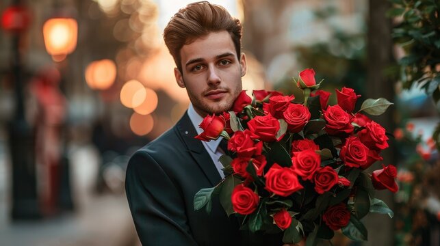 Romantic virtual date: man enjoys virtual connection with glass of wine and rose