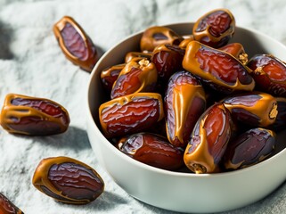Big luxury dried date fruit in bowls on a linen napkin, date concept with empty copy space for text.