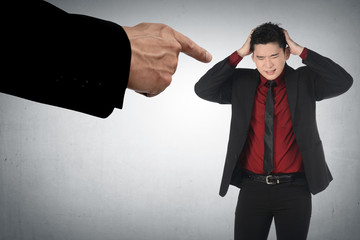 Stressed businesswoman surrounded by pointing fingers in office