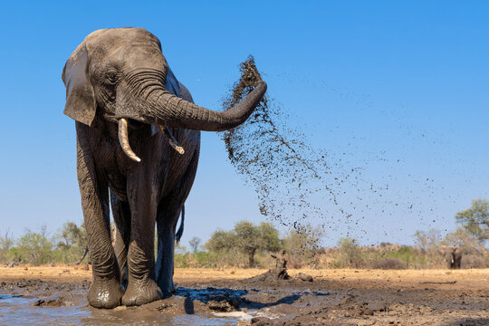 Elephants drinking ans taking a bath in a waterhole in Mashatu Game Reserve in the Tuli Block in Botswana.