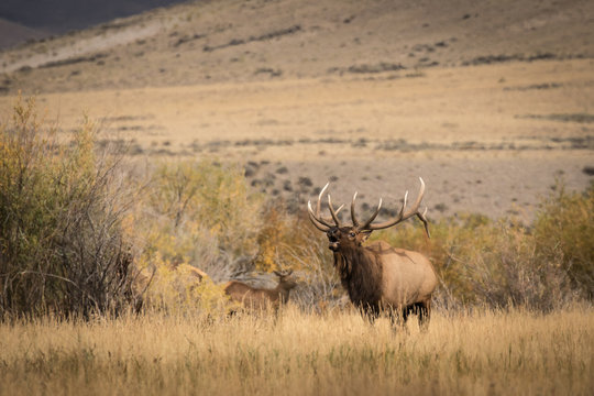 Bull elk resting with impressive antlers in autumn meadow north american wildlife