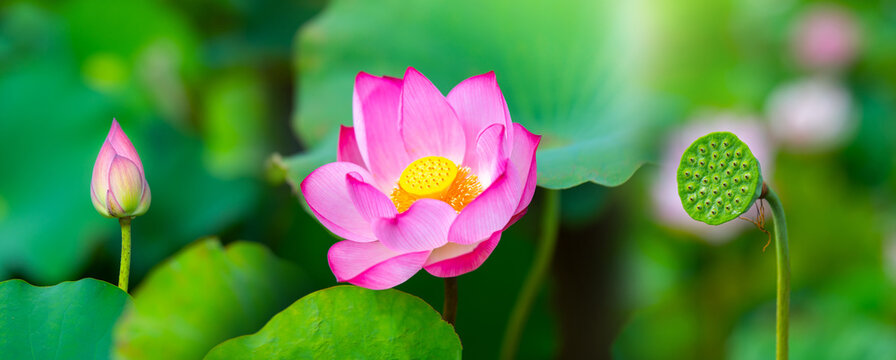 beautiful pink lotus flowers in the pond surrounded by big green leaves. Creative banner. Copyspace image