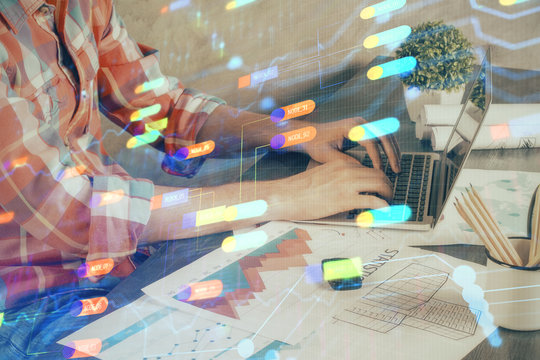 Multi exposure of technology hologram with man working on computer background. Concept of big data.