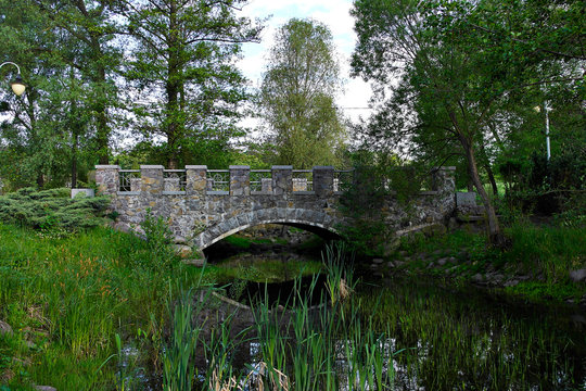 Kouvola, Finland - 25 September, 2019: Autumn landscape of bridge with moving passenger train and Kymijoki river waters in Finland, Kymenlaakso, Kouvola, Koria