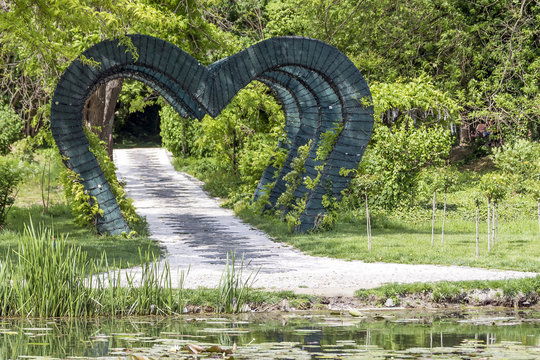 Tunnel of love made with large green hearts in an alley in the Alexandru Buia Botanical Gardens in Craiova, Romania