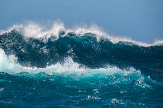 A big blue beautiful ocean wave crashing down