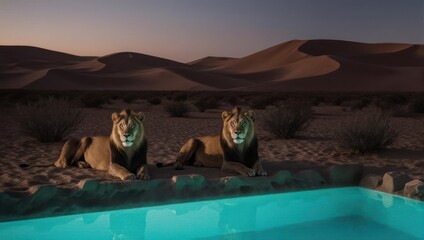 two lions in the golden evening sun, majestic lions at sunset, lion duo in warm twilight light