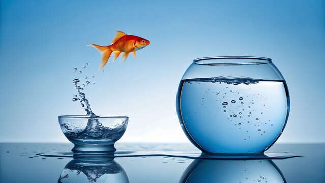 Vibrant Studio Image of a Goldfish Leaping from a Small Bowl to a Large Fishbowl