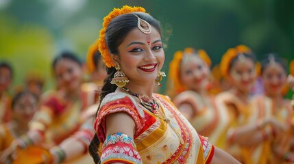 A girl in traditional attire smiles during a festival with a blurred background photo captured at Bihu in Assam India