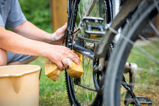 Man cleaning the bicycle by yellow sponge and preparation / product for washing