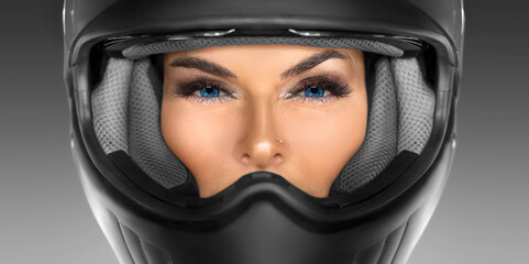 Close-up portrait of a woman in a motorcycle helmet.