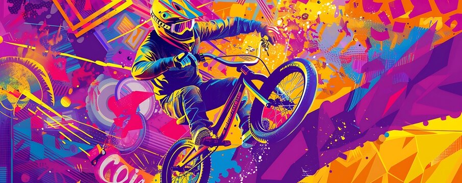 bmx bicycle biker on purple yellow abstract city background, concept of extreme sport style banner, world bicycle day