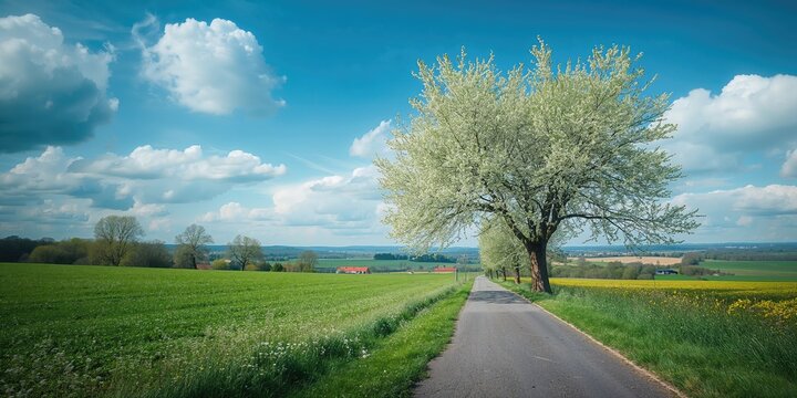 Blooming trees along a bikeway in south Germany in spring, serving as a scenic backdrop for editorial headers