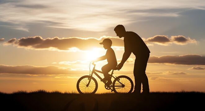 Father Teaching Son to Ride a Bike at Sunset A Silhouette of Cherished Moments