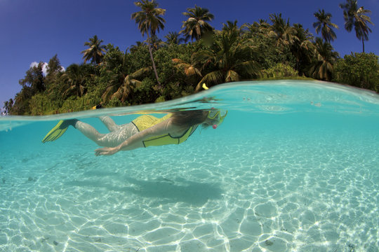 Beach travel vacation top down drone photo of luxury tropical paradise beach with elegant woman swimming in perfect turquoise water in coral reef lagoon ocean by beach. Palm trees on atoll
