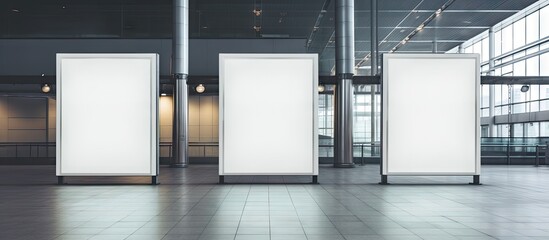 A high-ceilinged train station with blank billboards on the walls, soft, diffused lighting from hanging fixtures, wide, uncluttered walkways, and a serene atmosphere, with a focus on the emptiness